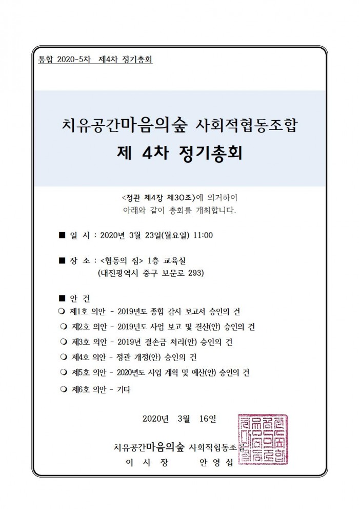 [재공지] 제 4차 치유공간마음의숲 사회적협동조합 정기총회