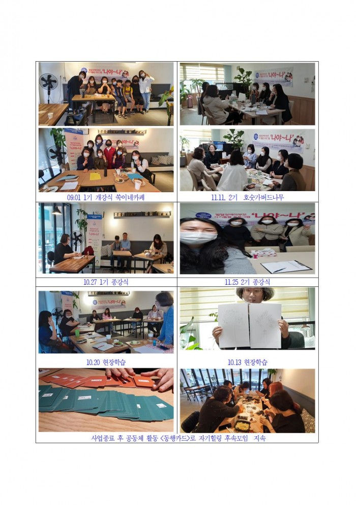- ”아이들에서 벗어나 나를 중심으로, 관계 속에서 행복감을 느끼는 시간이었다. 이런 프로그램을 제공해준 평생교육진흥원과 치유공간마음의숲에 감사하다.
