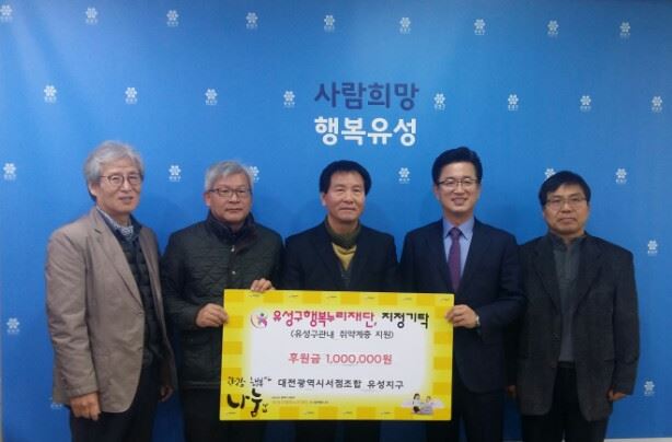 지난 11일에 대전광역시 서점조합 유성구지회(위원장 김진봉)으로 부터 저소득층을 위한 후원금 100만원을 기탁받았습니다.