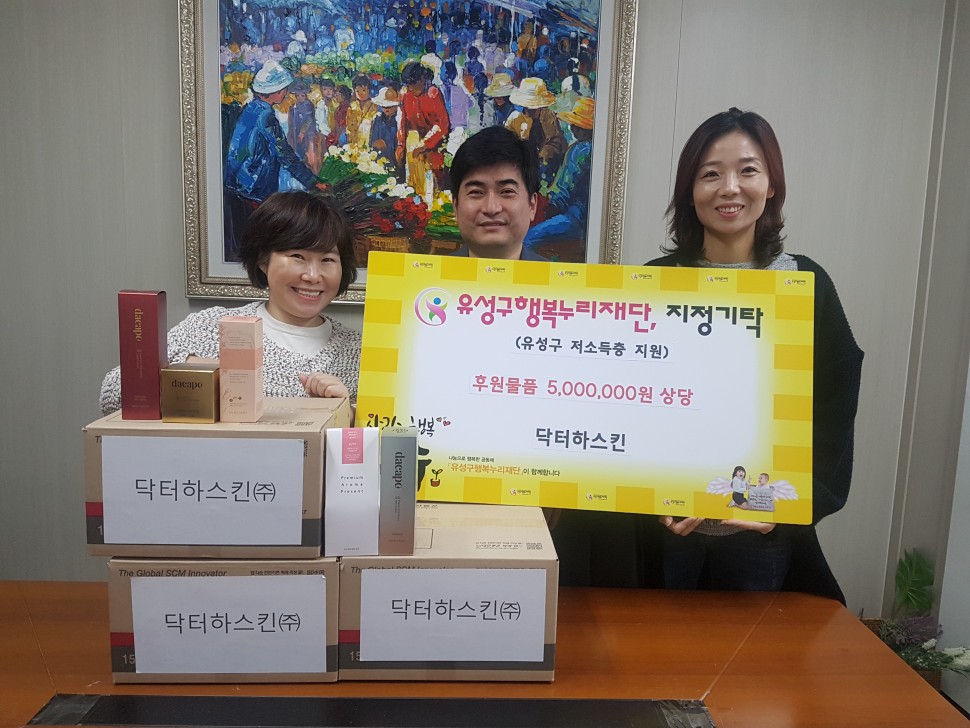 닥터하스킨은 매년 유성구 저소득가정이 좋은 화장품을 사용하고 몸도 마음도 건강해지기를 바라며 화장품을 기탁해 주시고 있습니다.