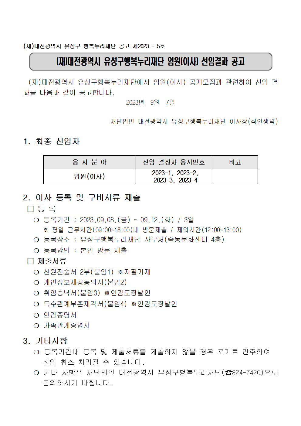 (재)대전광역시 유성구행복누리재단 임원(이사) 선임결과 공고