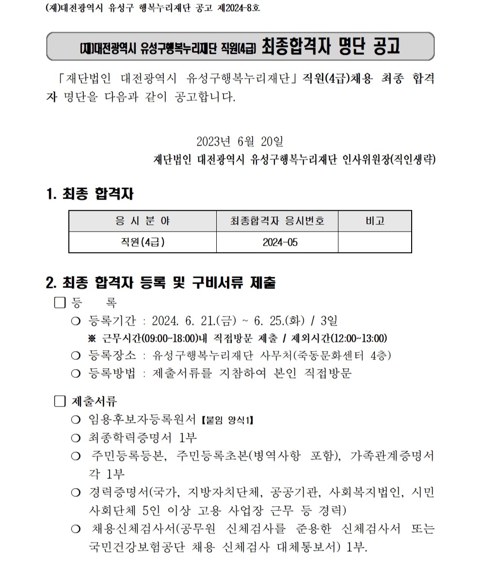 유성구행복누리재단 직원(4급) 최종합격자 명단 공고