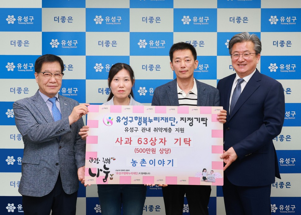 대전 유성구(구청장 정용래)는 25일 과일·채소 전문 매장 ‘농촌이야기(공동대표 김준섭·권수경)’가 500만 원 상당의 사과를 유성구행복누리재단에 기탁했다고 밝혔다.