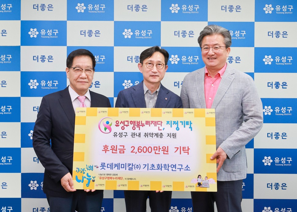 대전 유성구(구청장 정용래)는 23일 롯데케미칼(주) 기초화학연구소(소장 송보근)가 2025년 상반기 지역사회 나눔 활동의 일환으로 총 2,600만 원을 유성구행복누리재단에 기탁했다고 밝혔다.