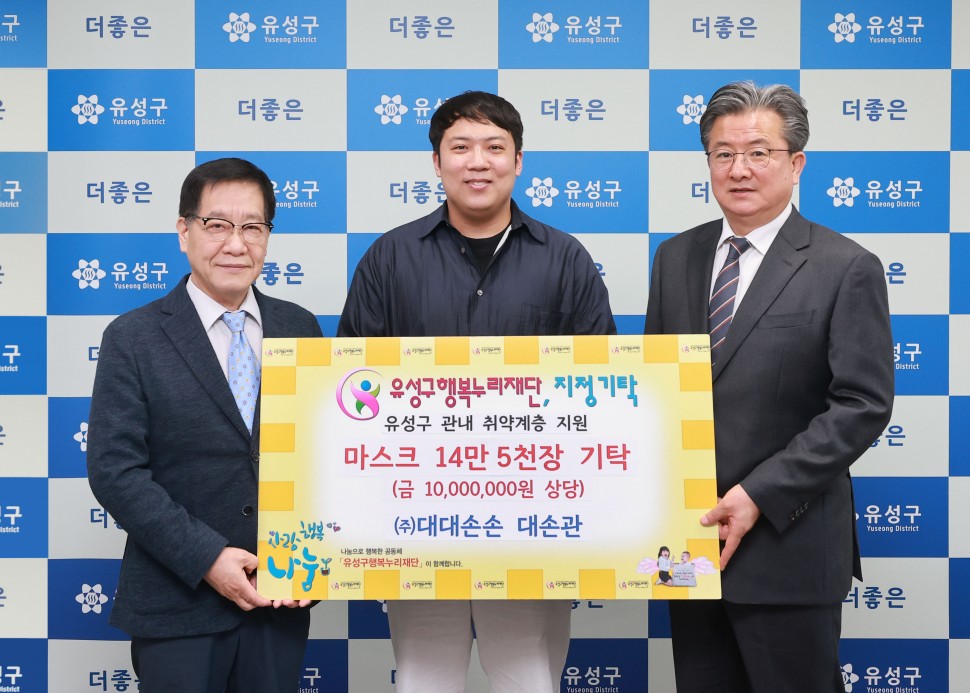 대전 유성구(구청장 정용래)는 7일 ㈜대대손손 대손관(대표 한종현)이 1,000만 원 상당의 덴탈마스크 14만 5.000장을 유성구행복누리재단에 기탁했다고 밝혔다.