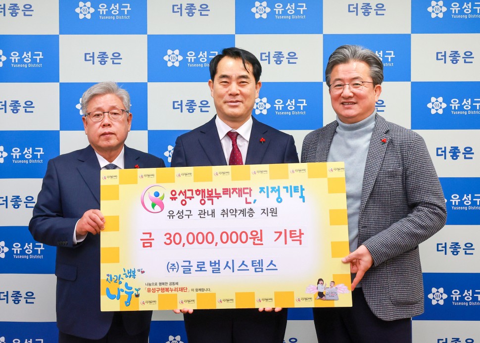 대전 유성구(구청장 정용래)는 20일 ㈜글로벌시스템스(공동대표 조영란, 박승국)로부터 후원금 3,000만원을 유성구행복누리재단에 기탁받았다고 밝혔다.