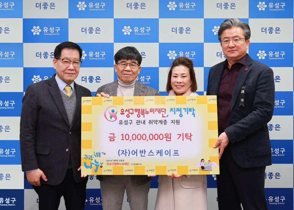 대전 유성구(구청장 정용래)는 30일 유성구의 유망중소기업인 (자)어반스케이프(대표 한재순)가 유성구행복누리재단에 1,000만원의 후원금을 기탁했다고 밝혔다.