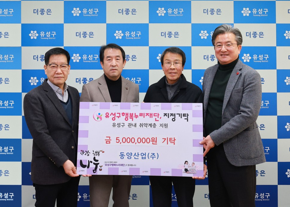 대전 유성구(구청장 정용래)는 26일 동양산업㈜(대표 장용걸)이 저소득층 지원을 위해 후원금 500만원을 기탁했다고 밝혔다.
