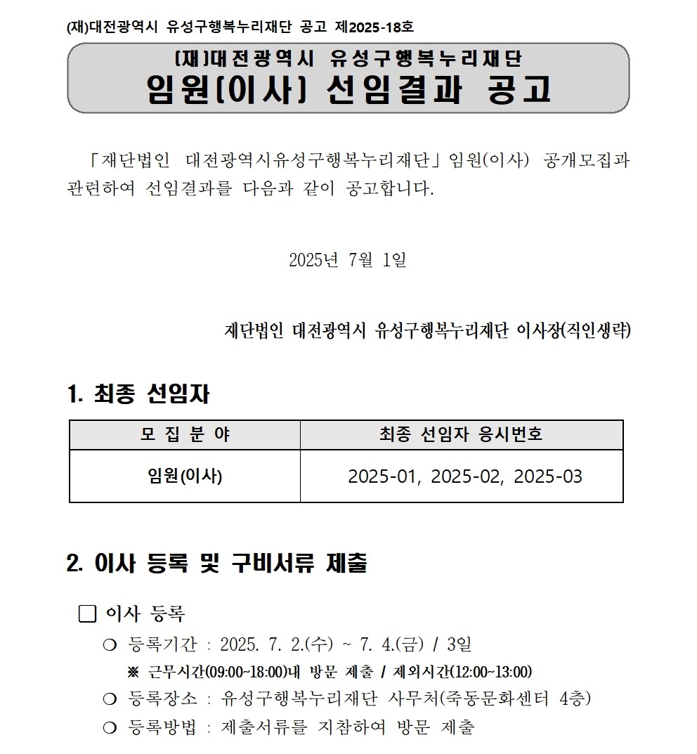 (재)대전광역시 유성구행복누리재단 임원(이사) 선임결과 공고
