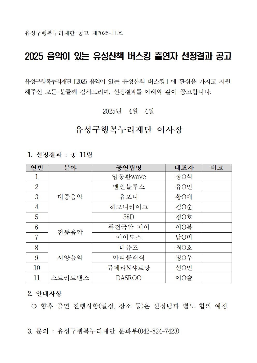2025 음악이 있는 유성산책 버스킹 출연자 선정결과 공고