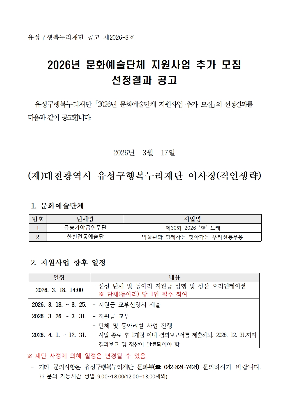 2026 문화예술단체 지원사업 추가 모집 선정결과 공고